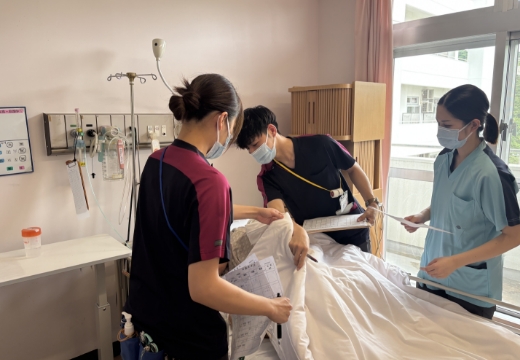 夜勤看護師と日勤看護師(先輩と二人)の3 名で受け持ち患者の部屋を訪室し患者状態の申し送りを受けます。患者さんへ受け持ち交代の挨拶をし点滴や酸素、ベッド柵と患者の安全確認を行っています。常に先輩が一緒にいるので安心です