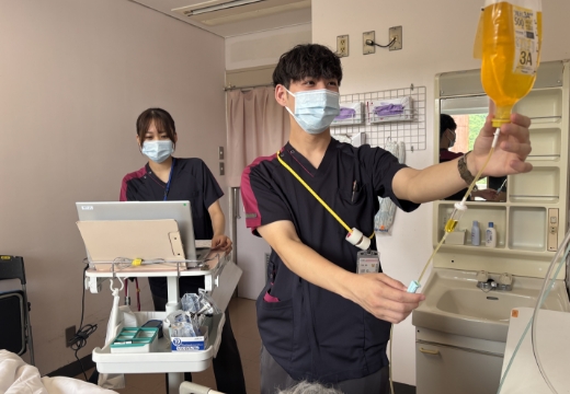 受け持ち患者さんの部屋を訪室しバイタルサインの測定、フィジカルアセスメントを行います。点滴指示がある患者さんへは先輩看護師に手技を確認してもらいながら点滴を実施します。