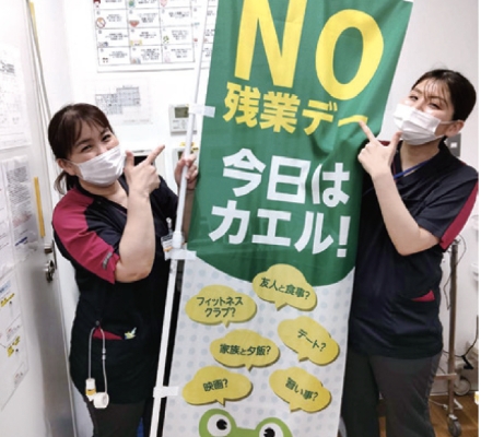 各部署持ち回りでのぼりを回し、のぼりが回ってきた部署はノー残業デーを推奨し早く帰る意識付けを行っています。