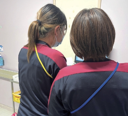 先輩看護師と一緒に一日の振り返りを行います。患者対応で困ったことや、上手くいった事などを振り返り次に活かせるようにしています。