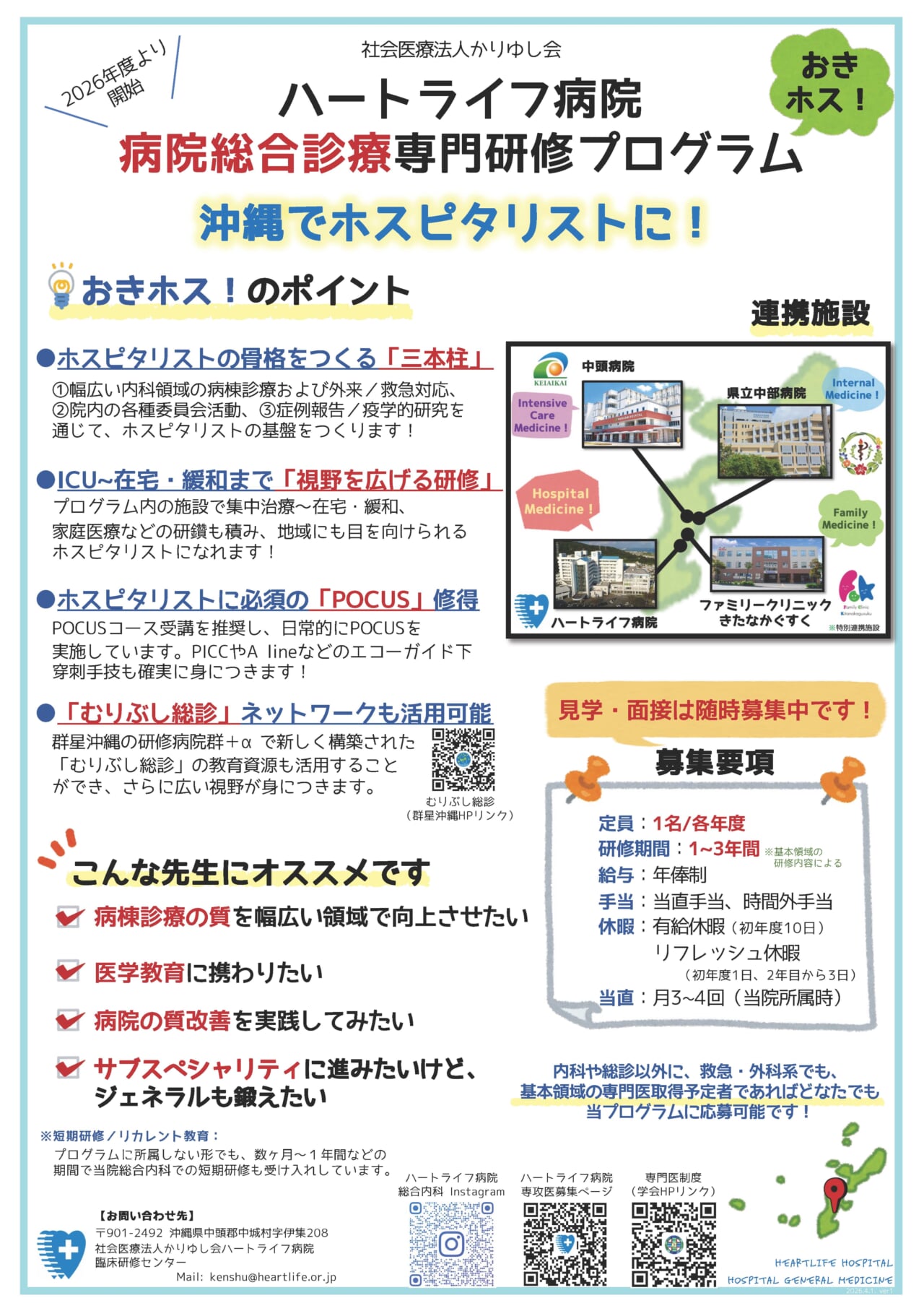 | 問い合わせ先 | ハートライフ病院 臨床研修センター 専門研修担当:新垣(あらかき)・古謝(こじゃ) TEL:098-895-3255(代表) E-Mail:kenshu@heartlife.or.jp |